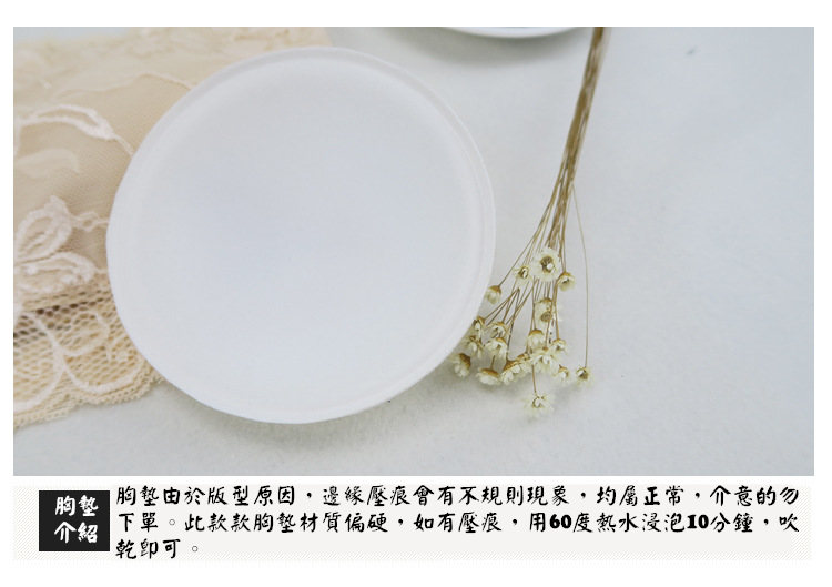 07. 胸墊介紹:胸墊由於版型原因,邊緣壓痕會有不規則現象,均屬正常,介意的勿下單。此款款胸墊材質偏硬,如有壓痕,用60度熱水浸泡10分鐘,吹乾即可。