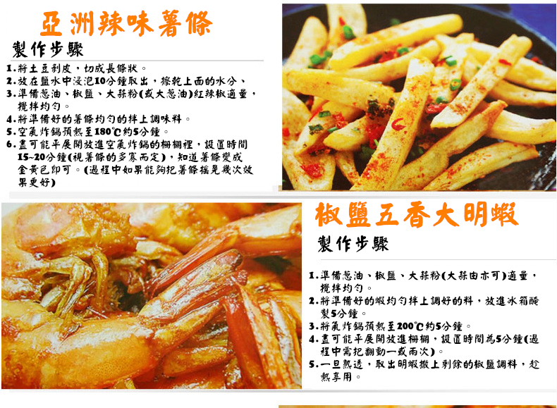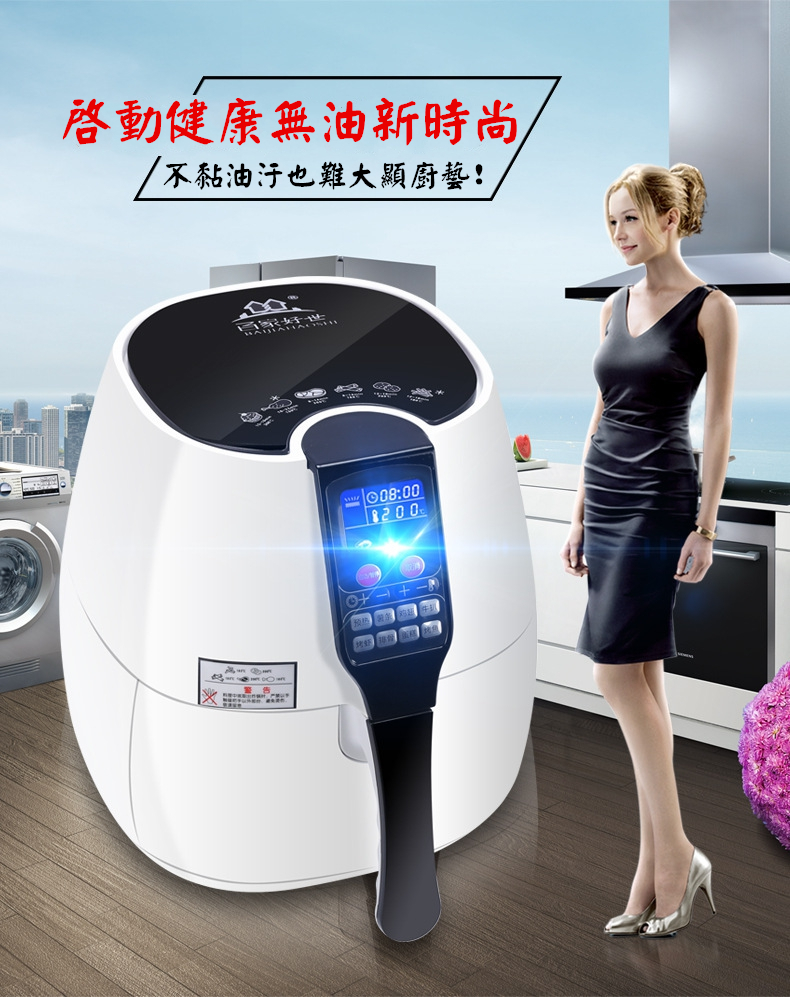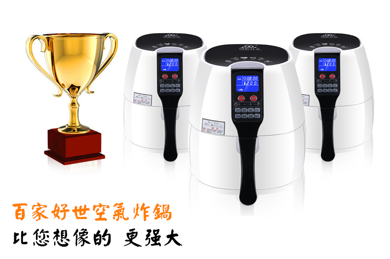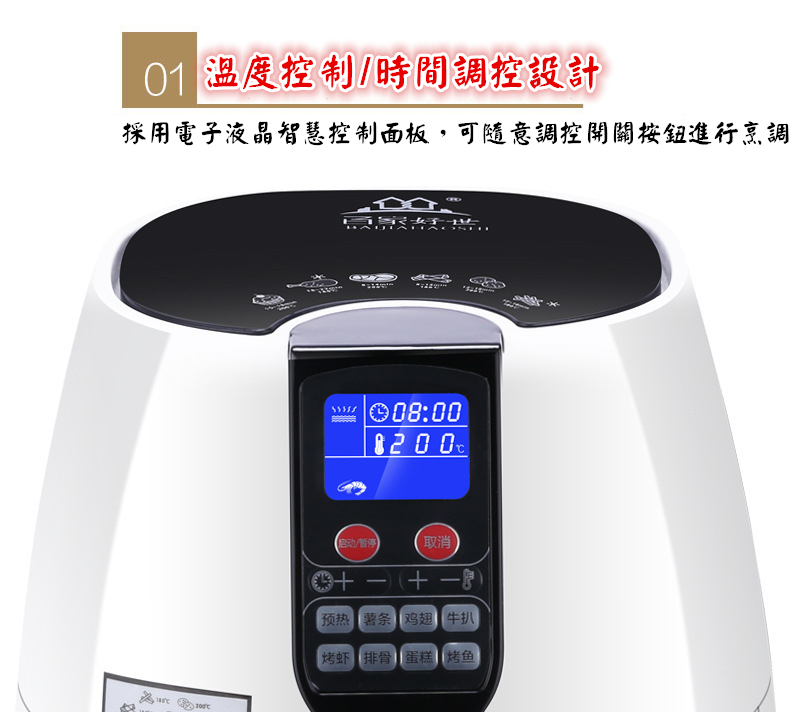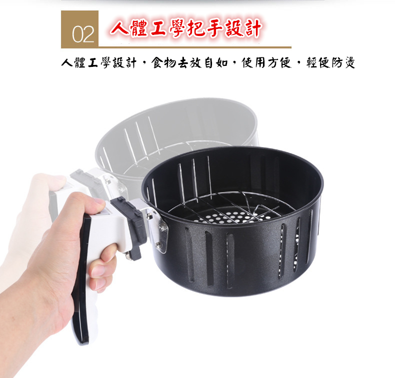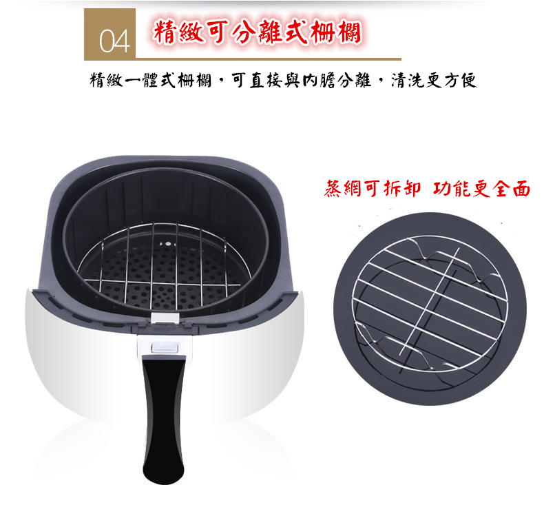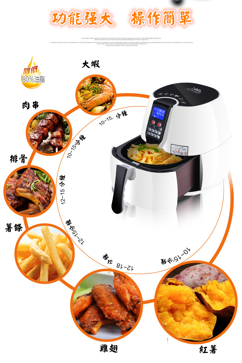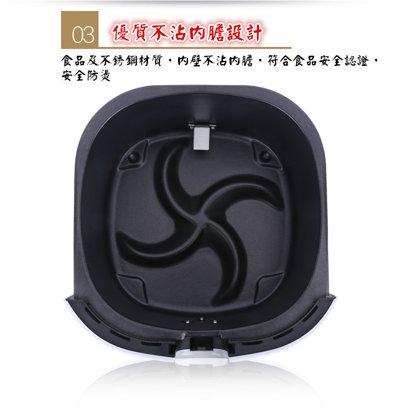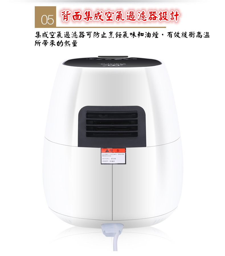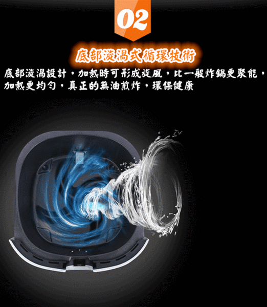- 漩渦循環,食物受熱均勻:應用漩渦式熱風循環技術,使食物上下的炸熟速度一致,加熱更均勻,真正的無油煎炸,環保健康。
