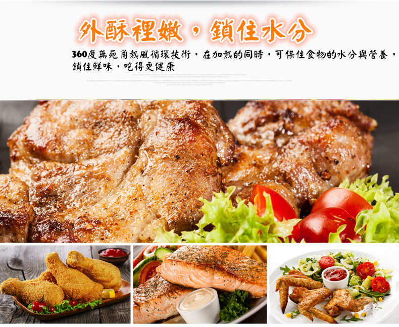 - 食物外酥裡嫩,鎖住水分:360度無死角熱風循環技術,在加熱的同時,可保住食物的水分與營養,鎖住鮮味,吃得更健康。