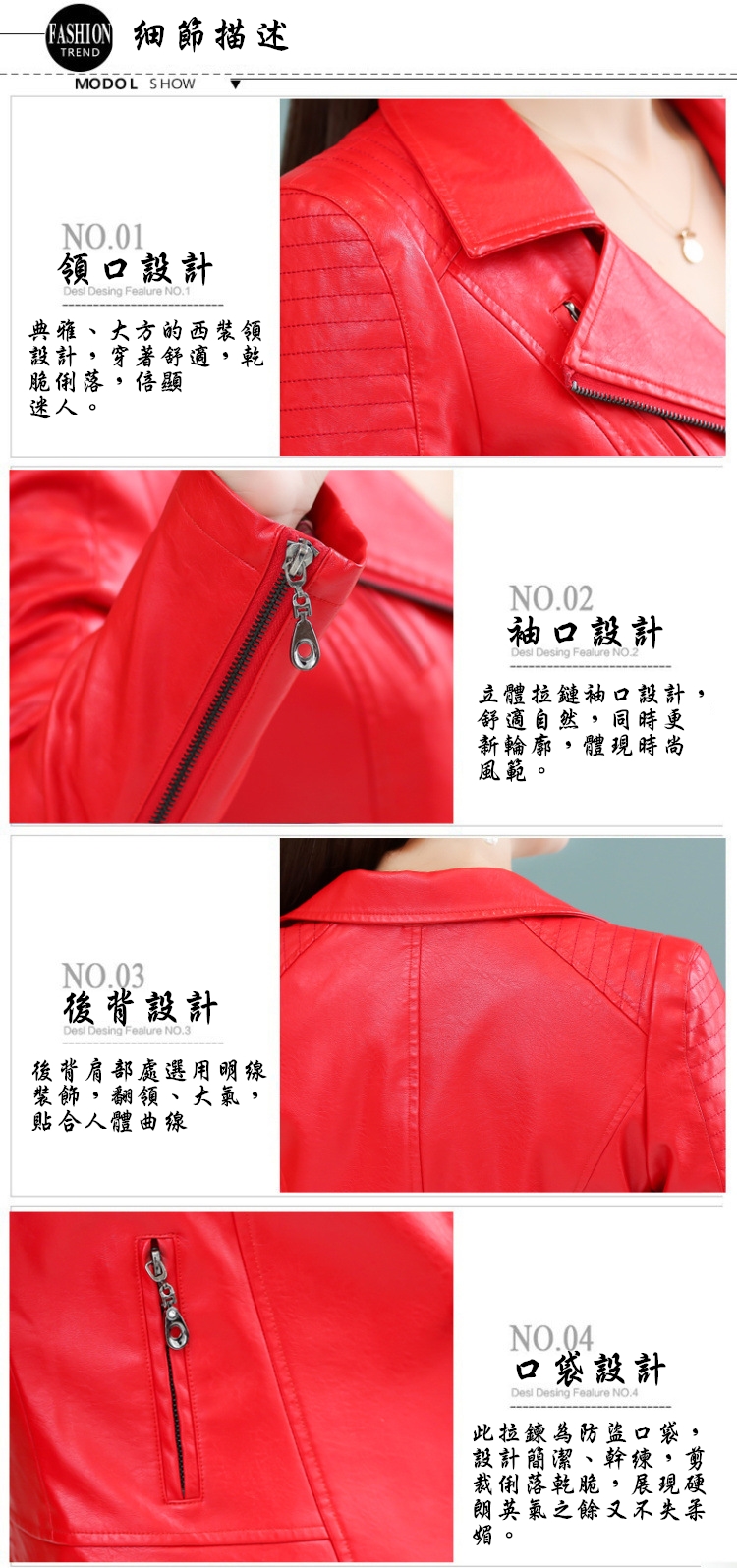 這款韓版皮衣夾克非常時髦且修身顯瘦,像真皮般的觸感與外觀,後背有修身收腰剪裁,穿起來很挺有型。目前有黑、粉、紅、橘四色可供選擇,尺碼從M至4XL都有,不論胖瘦都有適合您的尺寸可穿。