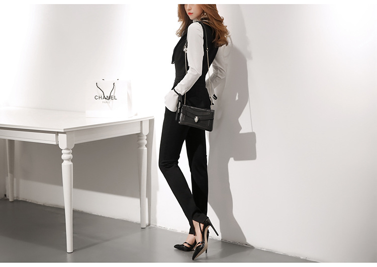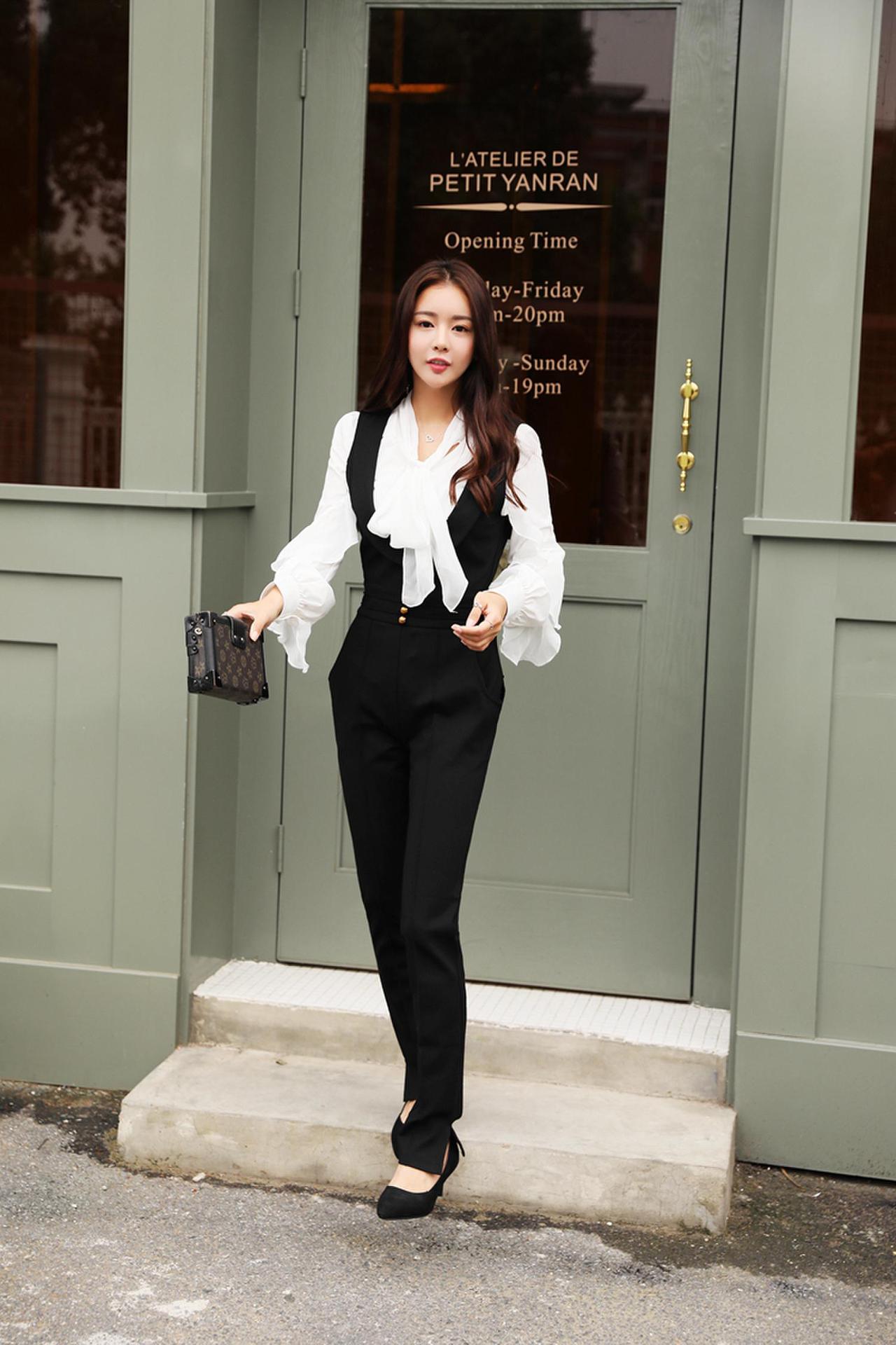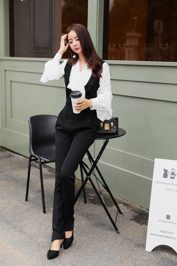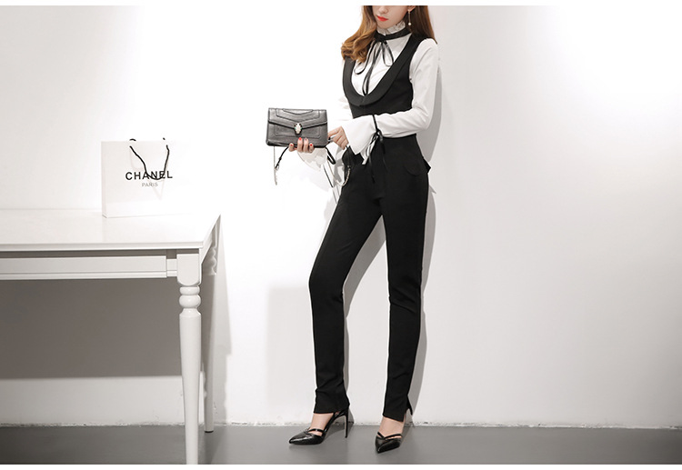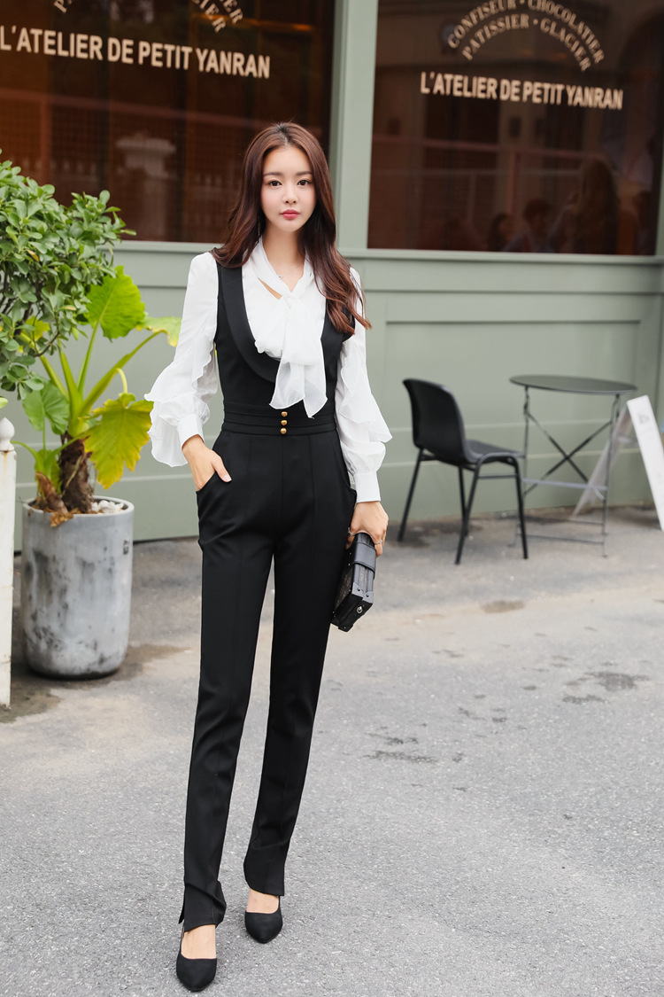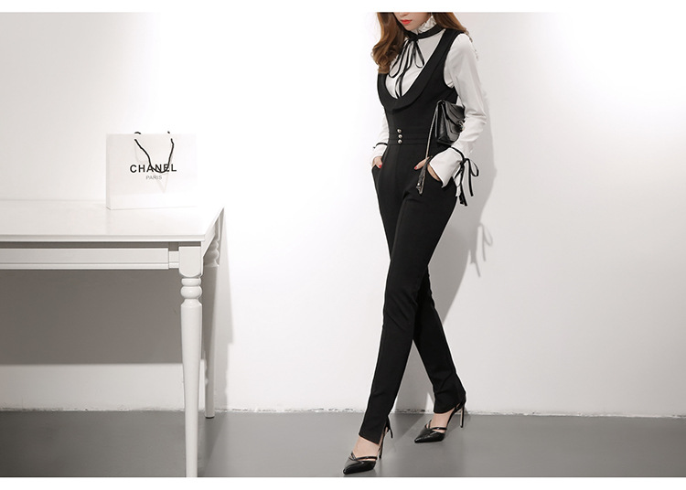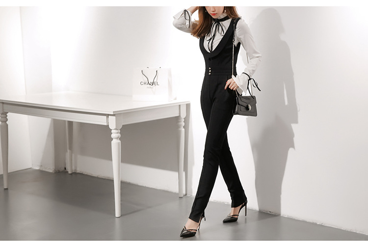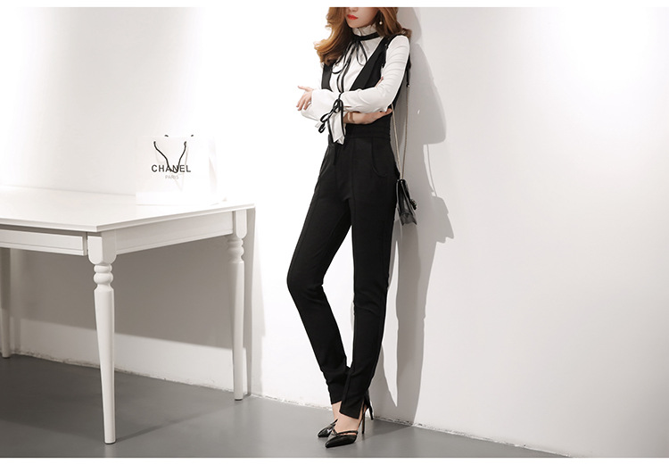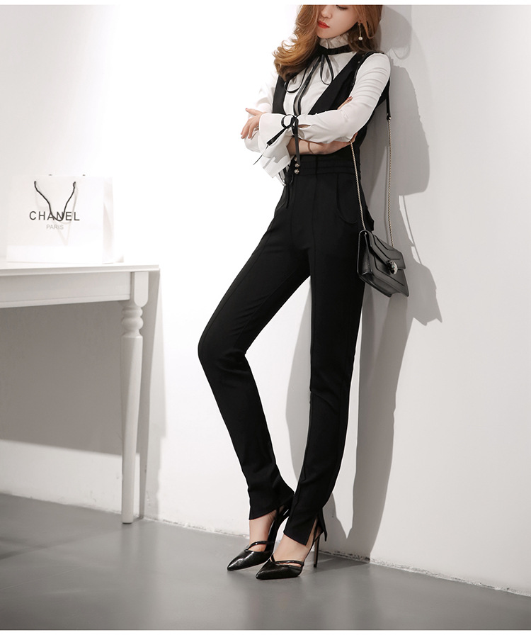 此款黑色吊帶窄腳褲非常時髦,穿起來高貴大方,且修身顯瘦,可搭配黑白色不規則花邊襯衫。本頁面商品僅售吊帶窄腳褲。