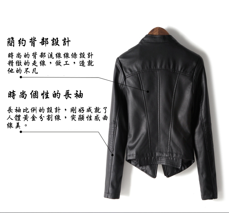 這款韓版皮衣夾克非常時髦且修身顯瘦,後背有修身收腰剪裁,整體線條流暢剪裁,穿起來很挺有型。尺碼從S至3XL都有,不論胖瘦都有適合您的尺寸可穿。